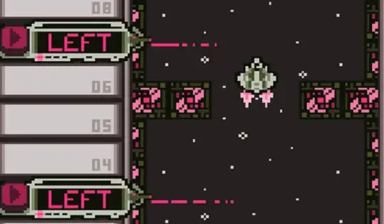 Get your spaceship across the finish line without crashing. The screen is divided into two parts: the timeline on the left and the flight track on the right. In the timeline, click the arrow next to a command to change it, then drag to move it up or down. When you are ready, press GO and the spaceship will execute the commands in the timeline.
