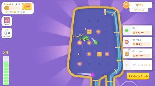 ピンボール ボードをセットアップしましょう! ボード上のピースをクリックして動かします。ピースを配置する準備ができたら、マウスを放します。最初はピンを動かしてゲームを開始し、ゲームを進めていくと、カタパルトやライトなどの機能が追加されます。ボールがピースに当たるたびに、お金が稼げます。ボールを購入することもできます。同じ種類のボールを 3 つ集めると、ボールを結合できます。