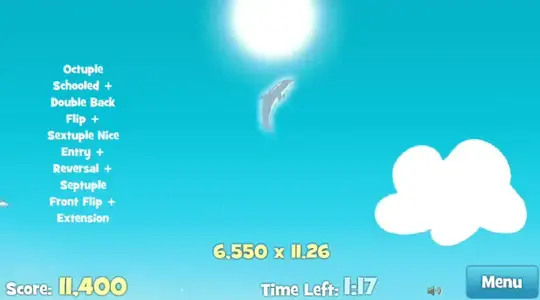 使用箭头键来控制你的海豚。用向上箭头向前游泳以跳出水面。在空中使用向左、向右和向下箭头进行技巧。降落在水中以进行良好的进入并获得速度提升!提高你的速度并将许多技巧串在一起来赚取积分。你有两分钟的时间来赚取尽可能多的钱。祝你好运!
